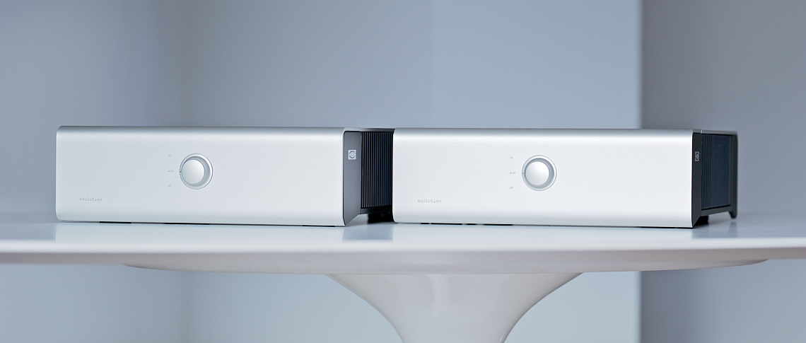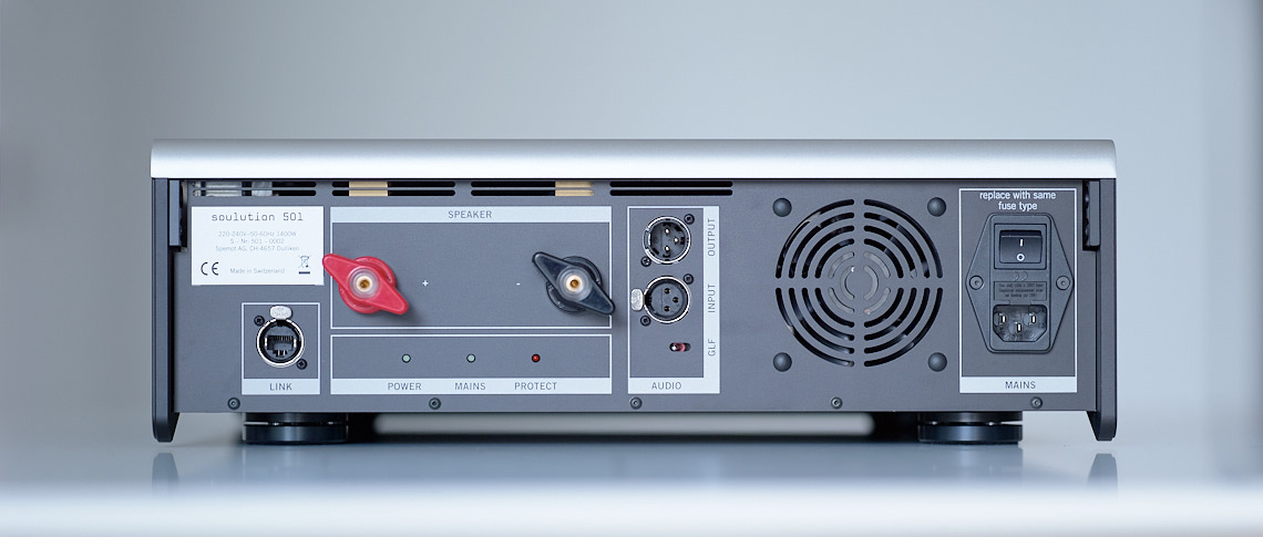 The 501 mono amplifier is operated via a rotary control on the front panel. It can be switched on remotely with other soulution devices via the LINK system.
