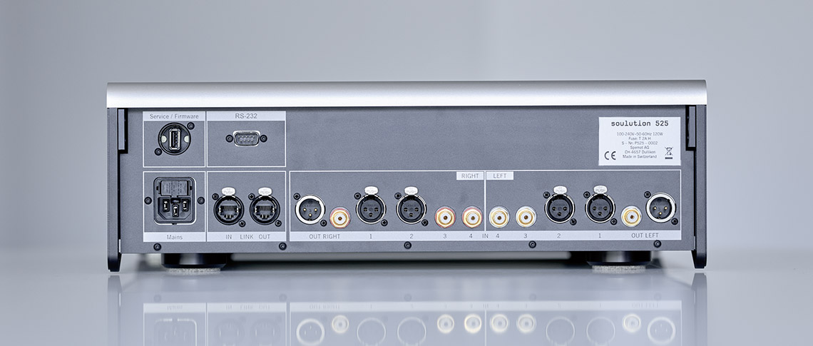 The 525 owes much to the design of the range-topping soulution 725 Preamplifier. It uses the same volume control which ingeniously combines the smooth fingertip control of variable resistors with the precision and stability of fixed resistor networks. For the 525 we’ve chosen the best performing Vishay Dale resistors with relays of the utmost quality. The end result is volume control that is finely adjustable in 95 steps of 1 dB each, with no perceptible switching clicks. Truly the best of both worlds.
