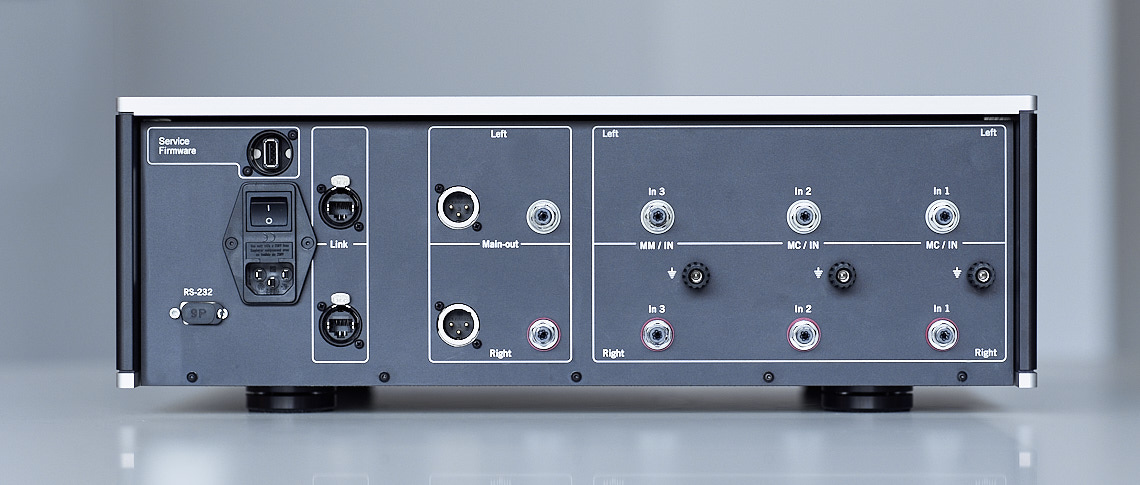 Unbalanced circuit design ensures having as few components in the signal path as possible. Dual-mono layout with discrete left and right channels maximise audio purity and virtually eliminates crosstalk. Input selection (including the ground connection) is done by high-grade relay. And input buffering ensures the 755 presents a benign load to the cartridges. For all three inputs (2 × MC, 1 × MM) the gain factor and the terminating impedance are freely selectable. To suppress rumble from warped records there is an IEC subsonic filter (< 20 Hz) which will protect loudspeakers against hazardous cone excursions. Mono operation is selectable as well.