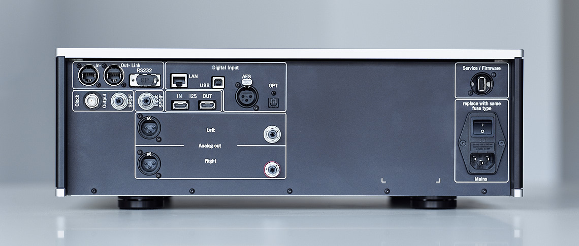A powerful SHARC DSP performs the 8 x oversampling to 24 bit/352.8 kHz or 24 bit/384kHz, depending on the digital input signa,l with the utmost precision. We believe precision of interpolation is more important than high clock rates. Our players and D/A converters use an algorithm from the highly regarded Anagram Technologies followed by Burr Brown D/A converters in a digital symmetric configuration. As we consider the PCM conversion technology as superior, the DSD signals get converted before its final D/A conversion.